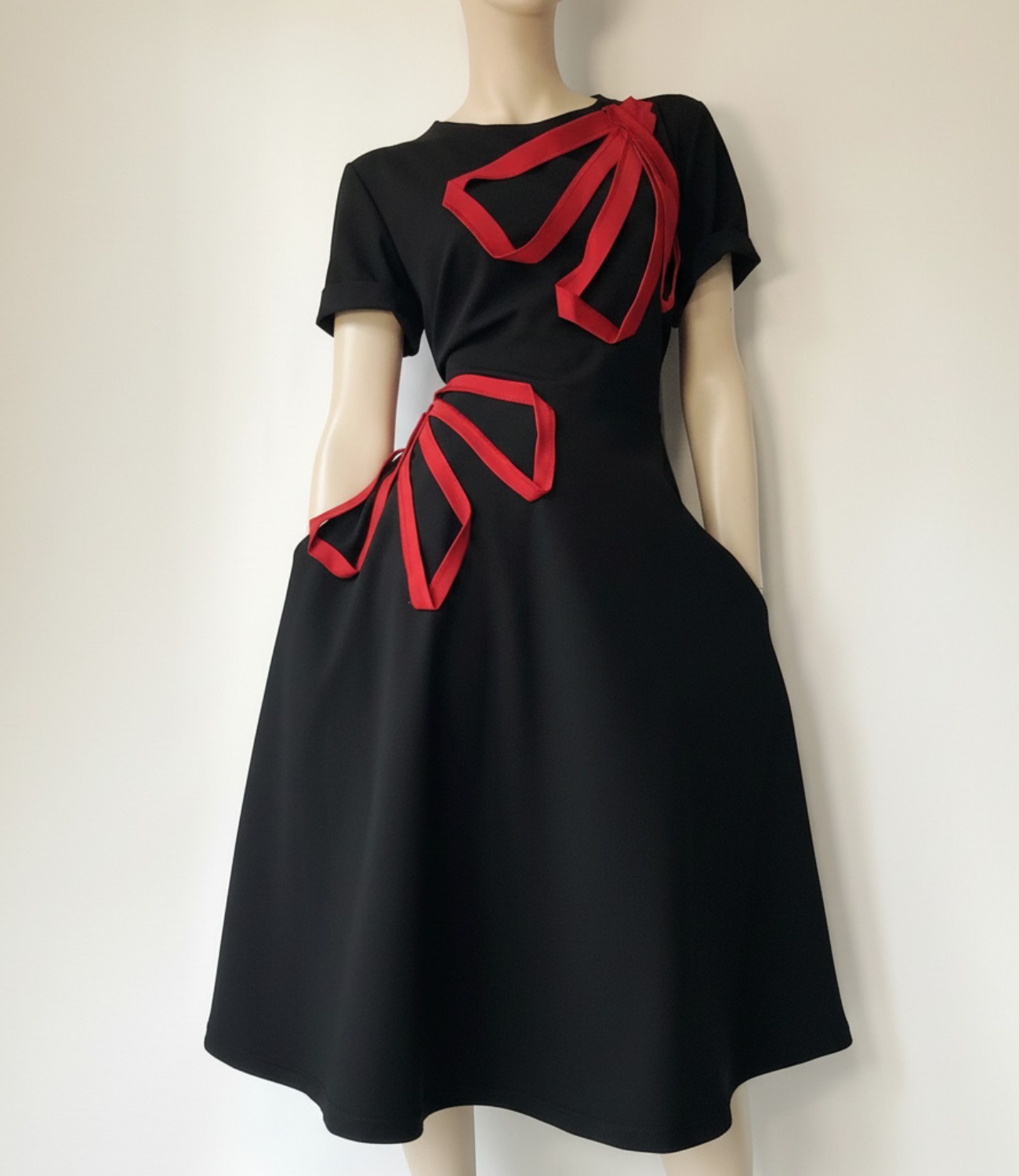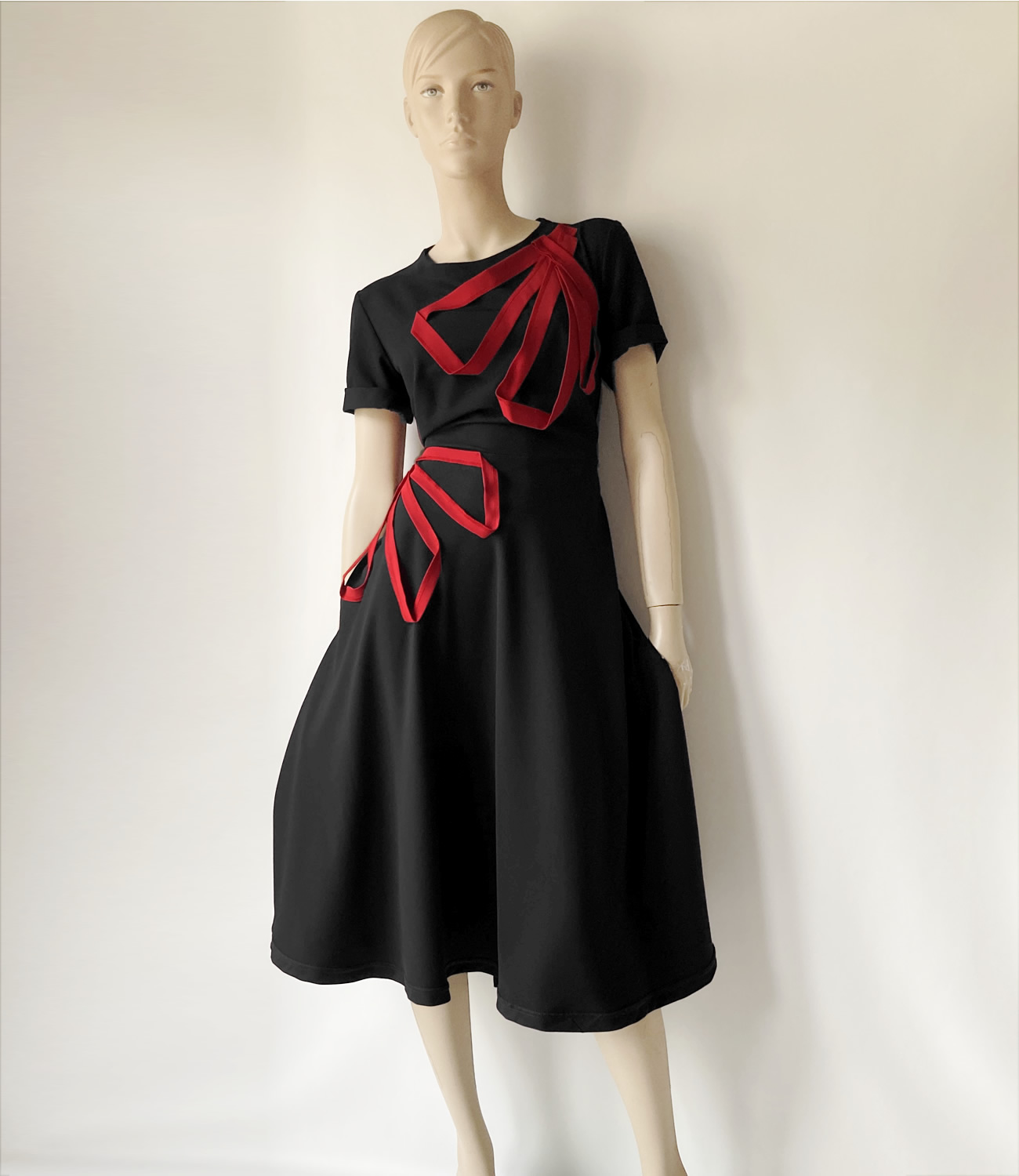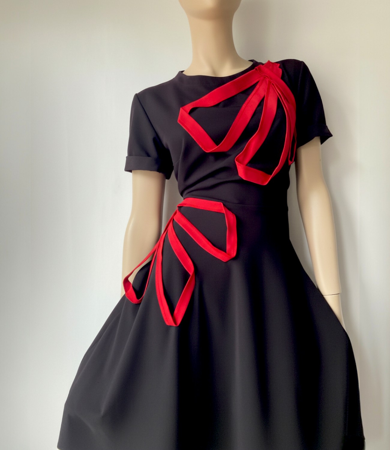 Haljina lagano povišenog struka crne boje. Na prednjem dijelu aplicirane trake cvjetnog motiva. Džepovi u bočnim šavovima. Black dress with a slightly raised waist. Floral motif appliquéd on the front. Pockets in the side seams.
