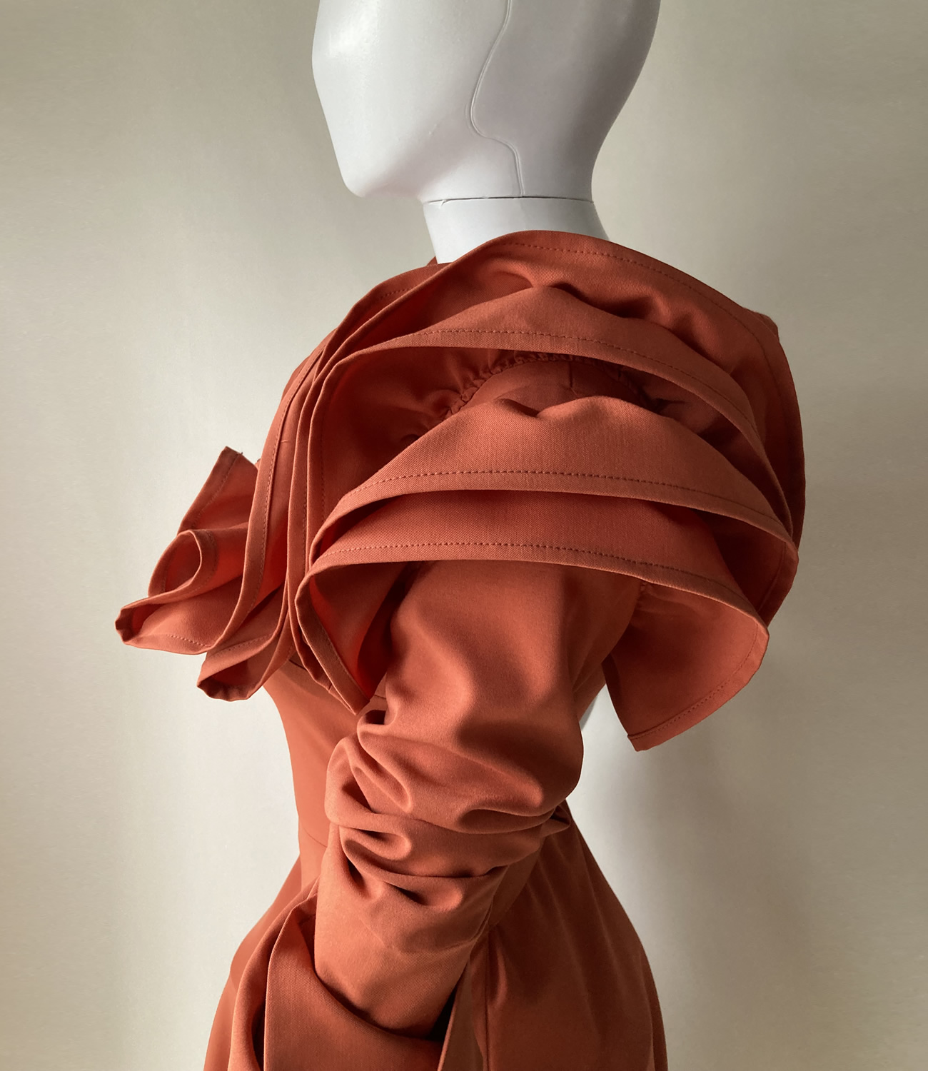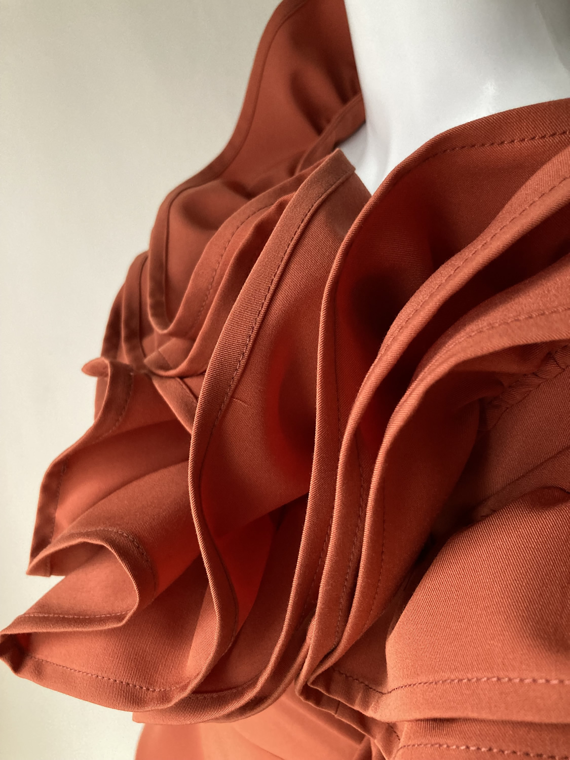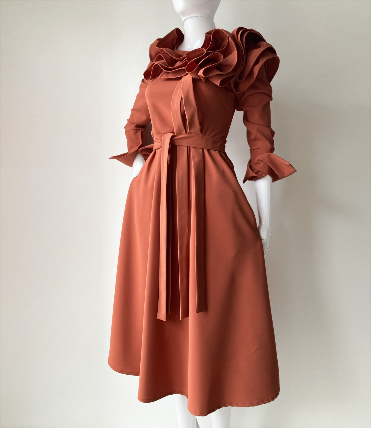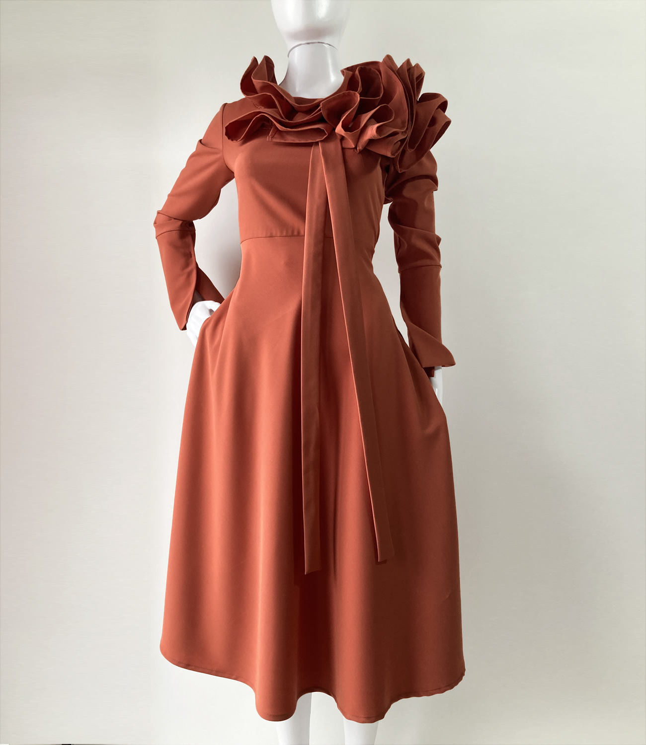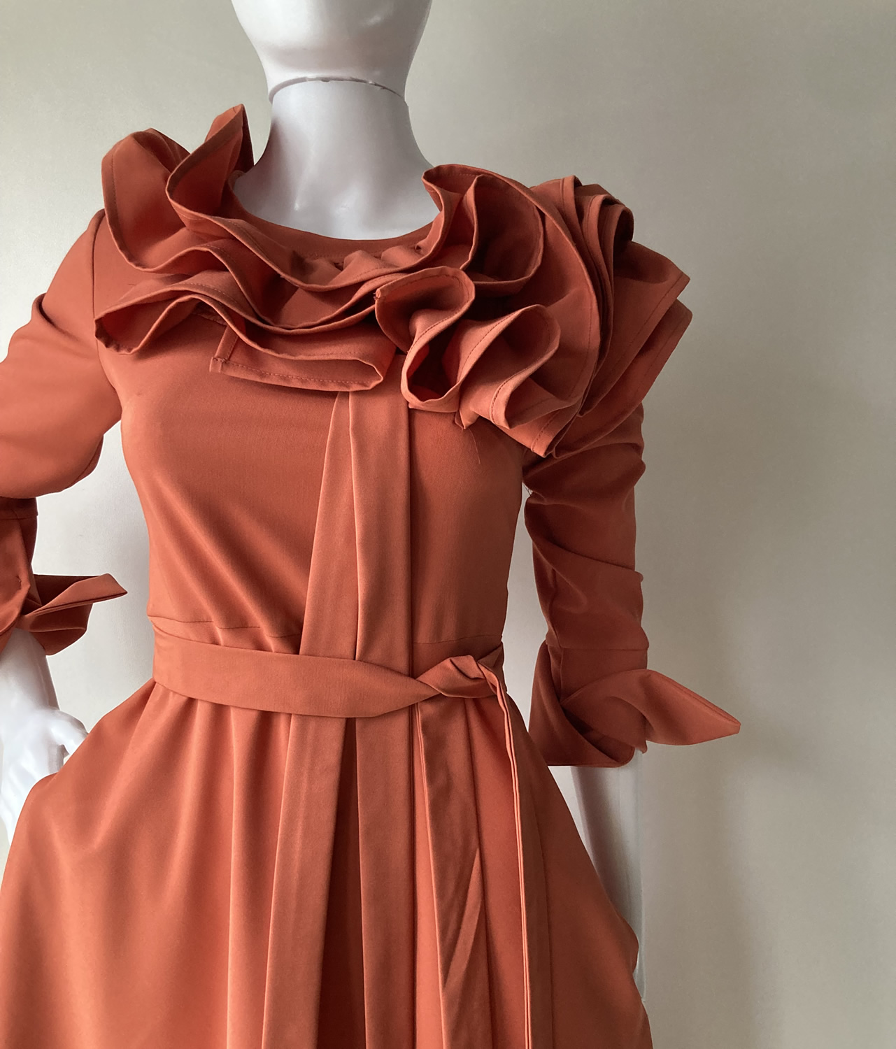 Haljina lagano povišenog struka , bogatog ovratnika i blago padajućeg donjeg dijela. Napravljena od pastelne narančaste tkanine. Džepovi u bočnim dijelovima . Također u bočnom šavu ušivene trake za povezivanje haljine na leđima i reguliranje širine u struku. Dress with a slightly raised waist, a rich collar and a slightly falling lower part. Made of pastel orange fabric. Pockets in the side parts. Also in the side seam sewn straps for connecting the dress at the back and regulating the width at the waist.