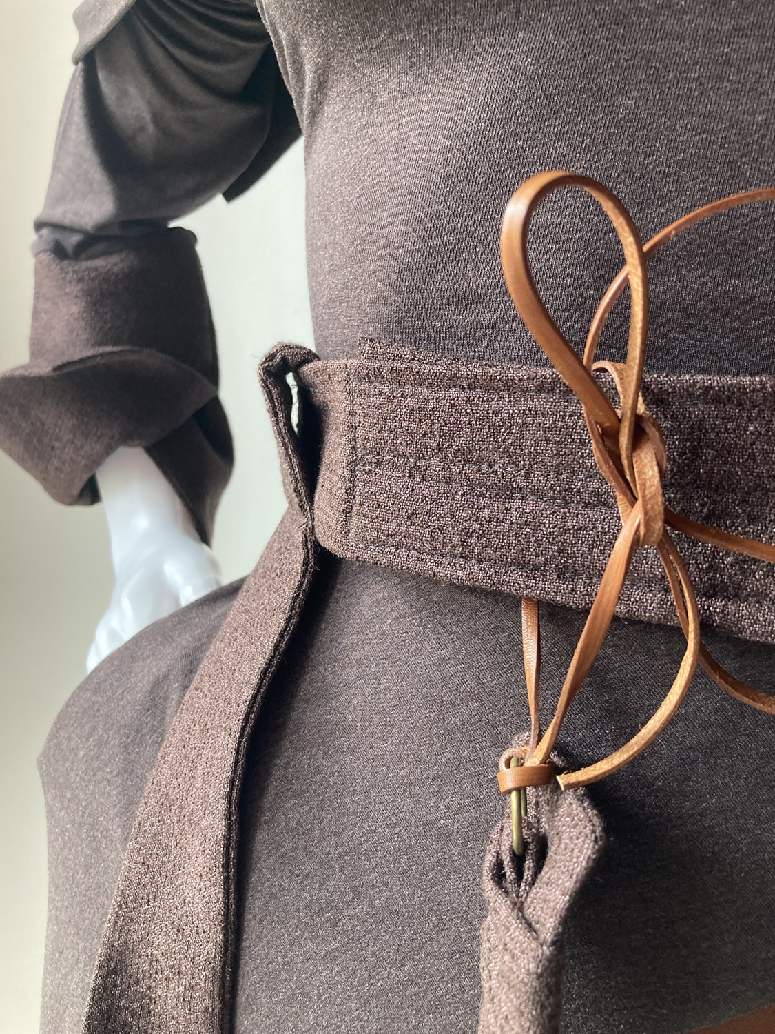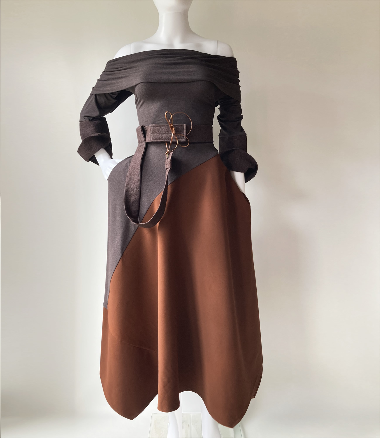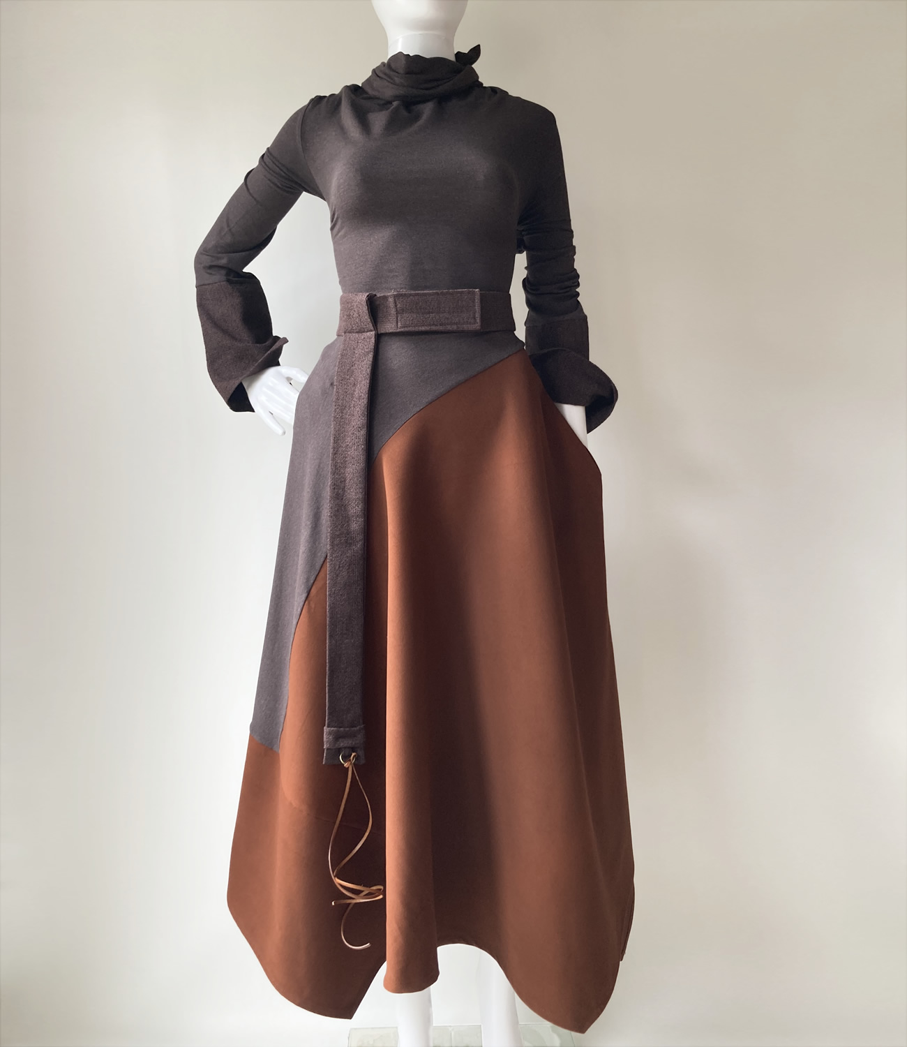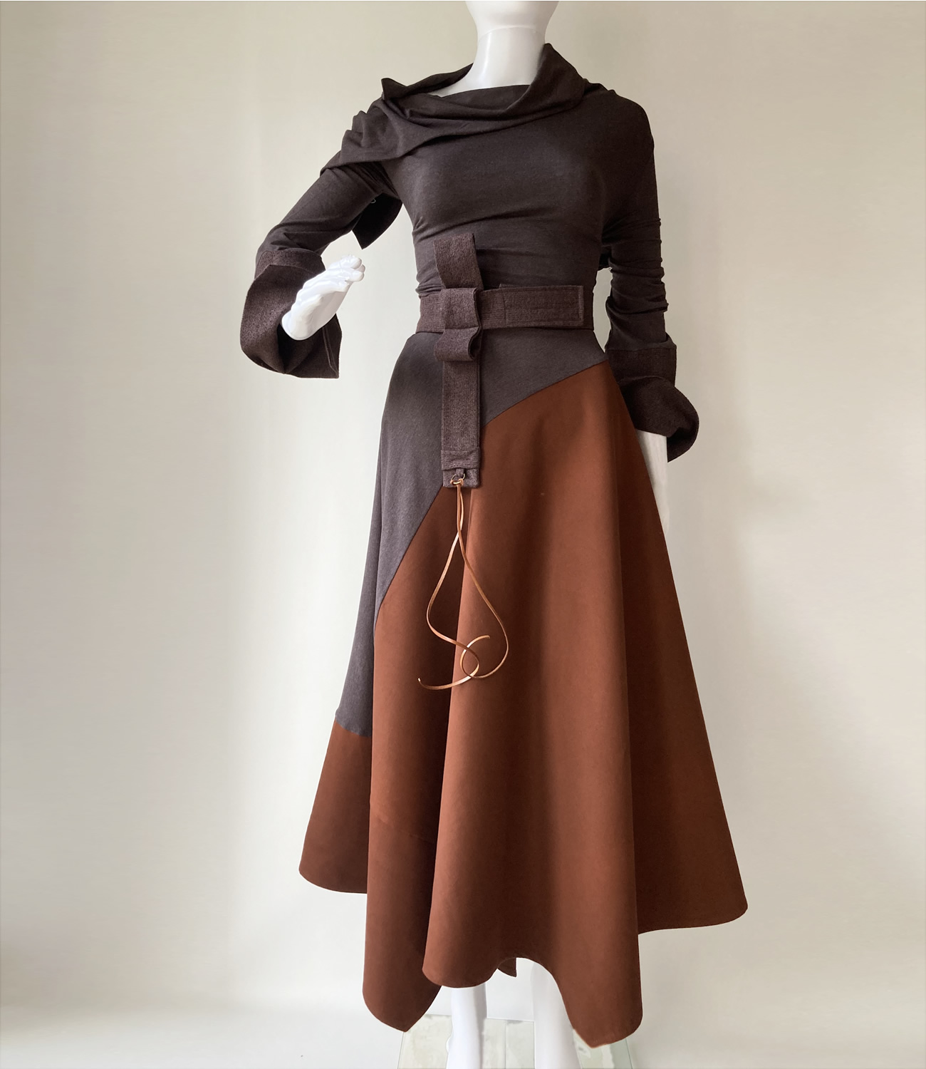 Strukirana haljina napravljena od različitih vrsta smeđe tkanine. Kragna se može spustiti na ramena ili povezati na leđima i napraviti zatvoreniji vratni izrez. Funkcionalni ukrasi na remenu omogućuju modifikacije.Waisted dress made of different types of brown fabric. The collar can be dropped on the shoulders or tied at the back to create a more closed neckline. Functional decorations on the strap allow for modifications.