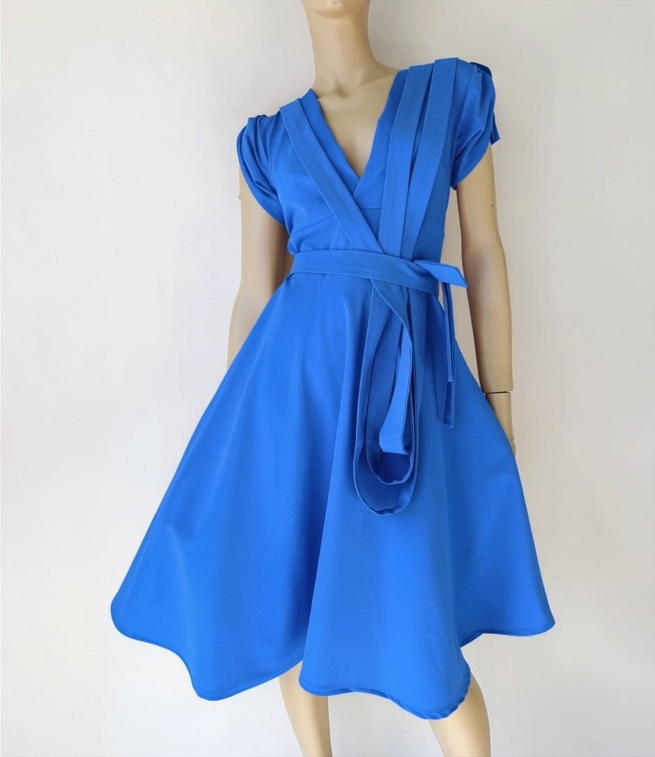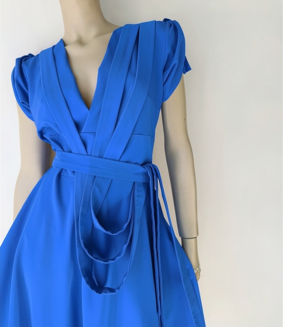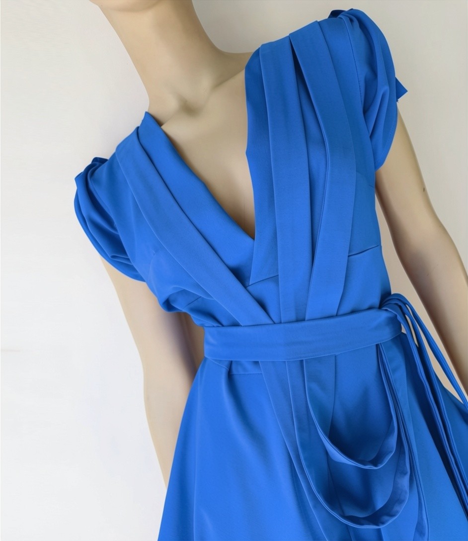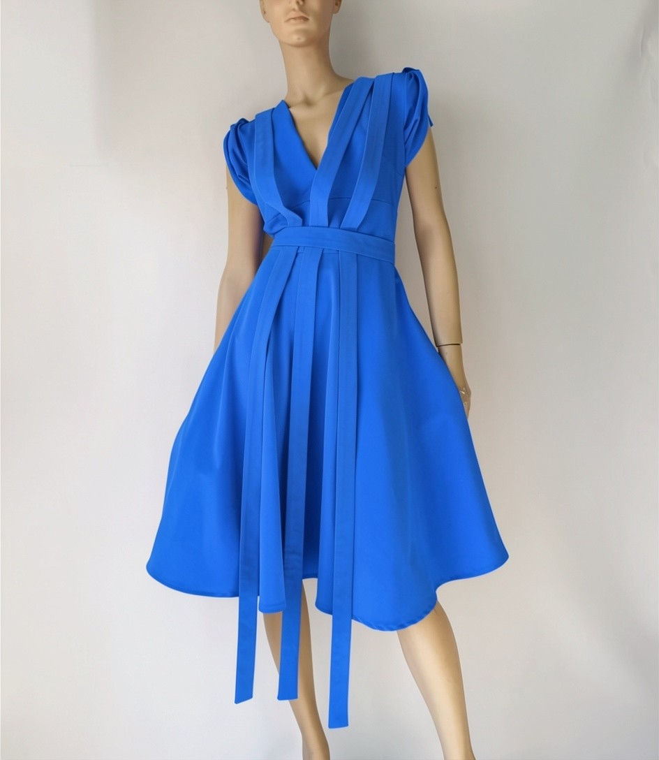 Strukirana haljina ukrašena trakama kojima se stiliziraju različiti izgled ili djelomično prekriva otvorenost vratnog izreza. Džepovi u bočnim šavovima. Waist-hugging dress decorated with ribbons for different looks or partially cover the openness of the neckline. Pockets in the side seams.