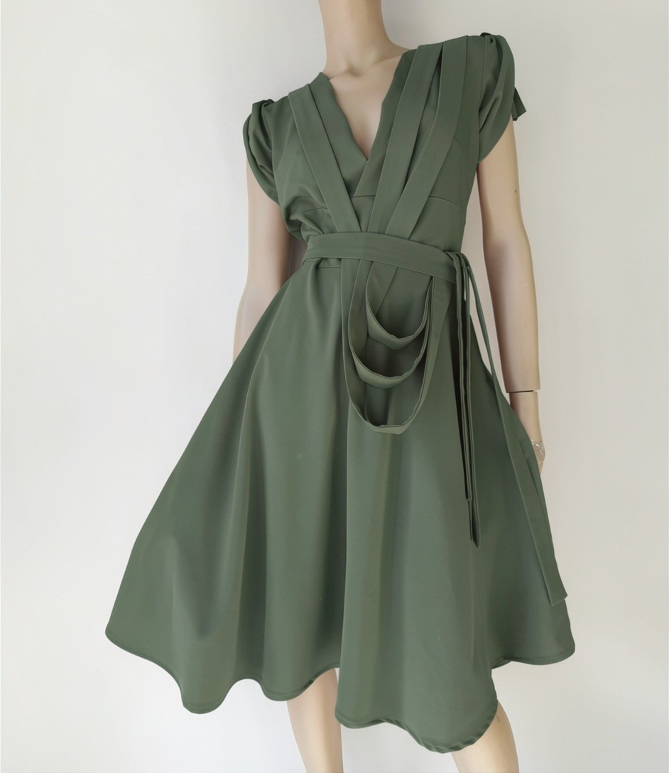 Strukirana haljina ukrašena trakama kojima se stiliziraju različiti izgled ili djelomično prekriva otvorenost vratnog izreza. Džepovi u bočnim šavovima. Waist-hugging dress decorated with ribbons for different looks or partially cover the openness of the neckline. Pockets in the side seams.