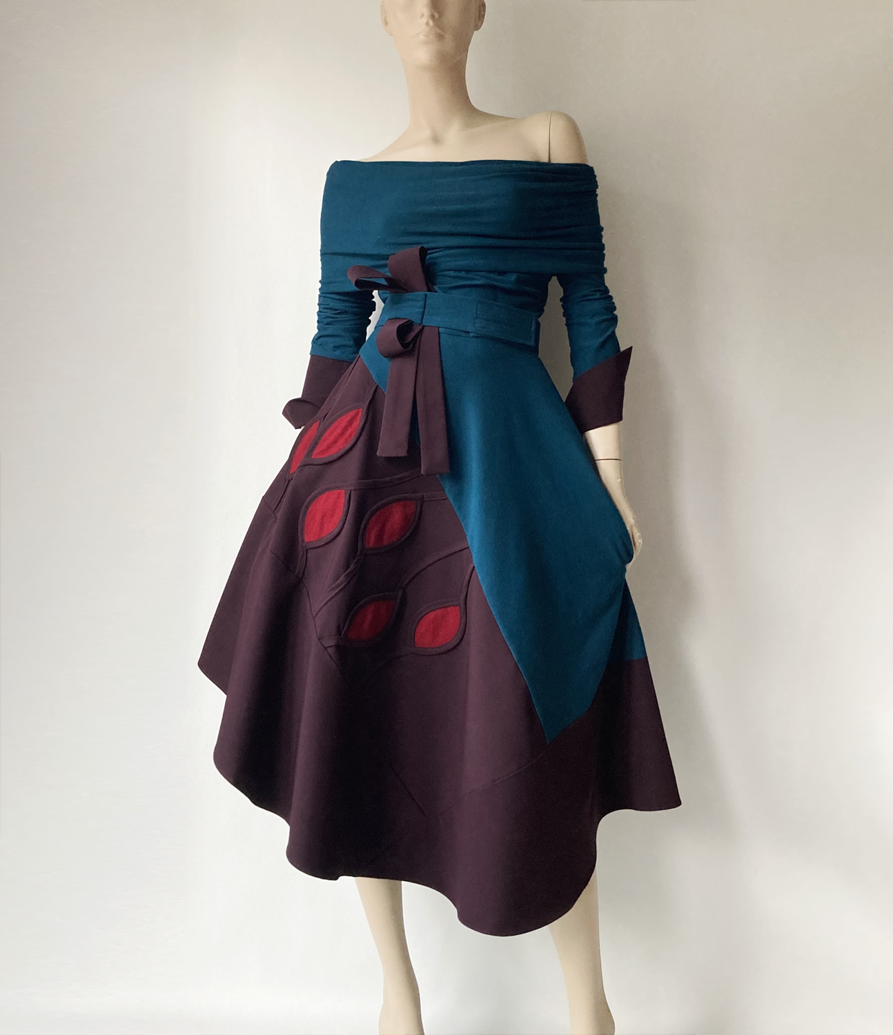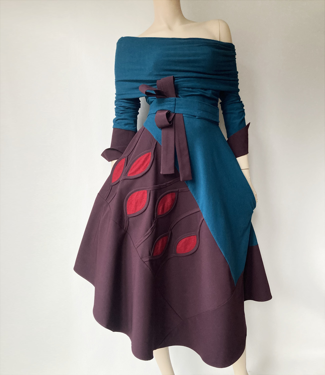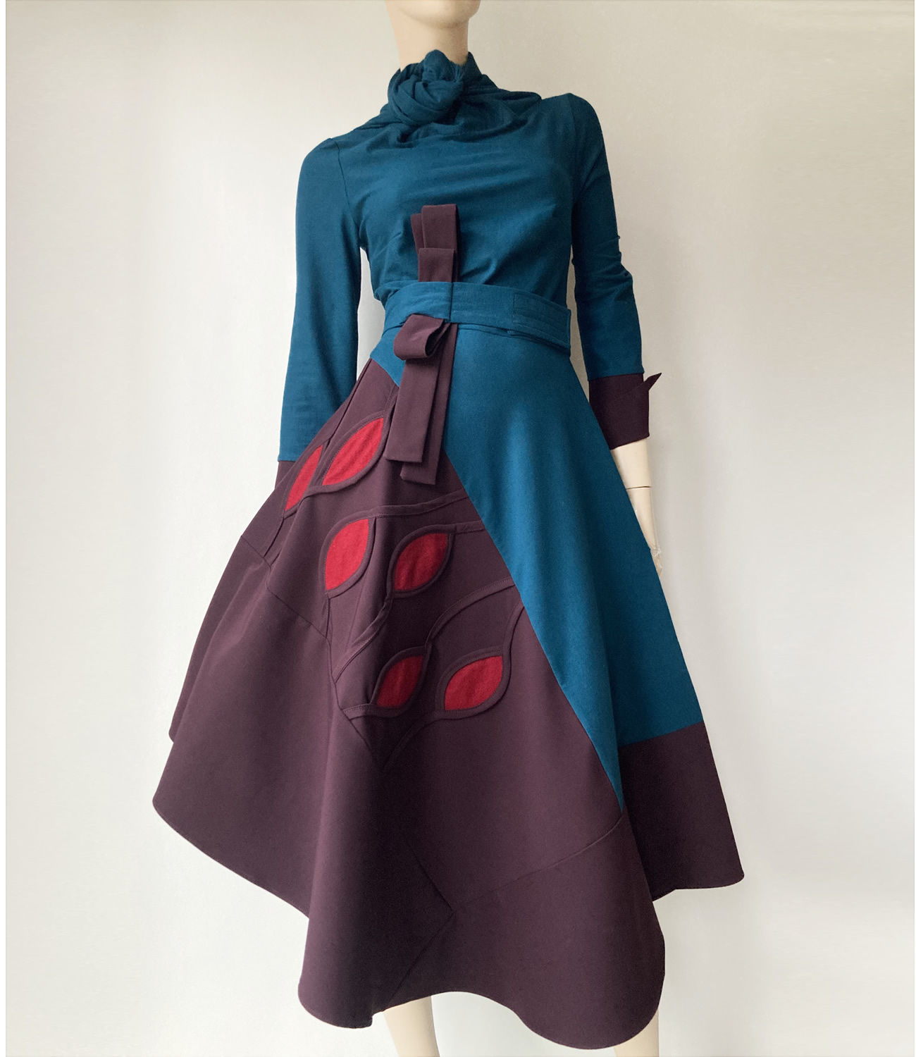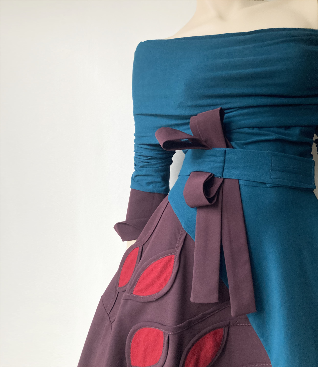 Strukirana haljina napravljena od različitih vrsta smeđe-crvenkaste i petrolej tkanine. Kragna se može spustiti na ramena ili napraviti viši,zatvoreniji vratni izrez. Funkcionalni ukrasi na remenu omogućuju modifikacije.Waisted dress made of different types of cherry-brown and blue. The collar can be dropped on the shoulders or create a more closed neckline. Functional decorations on the strap allow for modifications.
