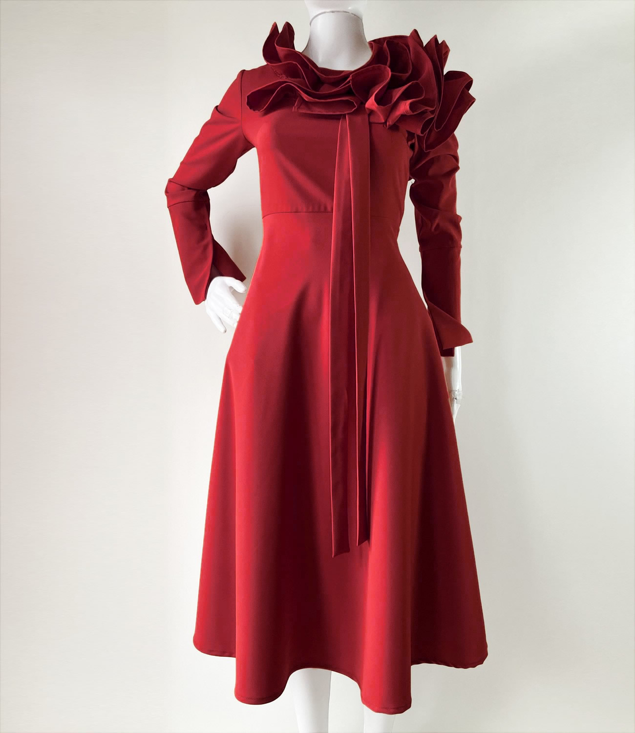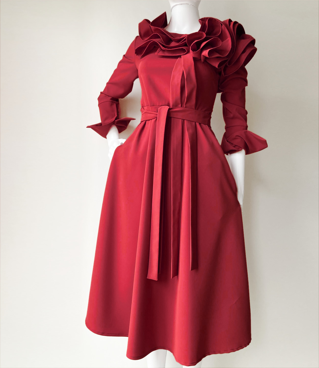 Haljina lagano povišenog struka , bogatog ovratnika i blago padajućeg donjeg dijela. Džepovi u bočnim dijelovima . Također u bočnom šavu ušivene trake za povezivanje haljine na leđima i reguliranje širine u struku. Dress with a slightly raised waist, a rich collar and a slightly falling lower part. Pockets in the side parts. Also in the side seam sewn straps for connecting the dress at the back and regulating the width at the waist.